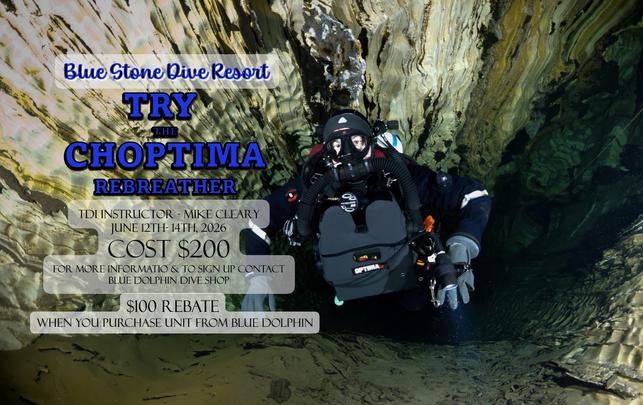 Mike Cleary TDI rebreather instructor will be coming to Bluestone June 12-14 to do a try rebreather class for anyone interested in upgrading to the CCR Choptima Chest Mount system. Cost for the course is $200 If you purchase a unit through Blue Dolphin, you will get a $100 rebate. Call Blue Dolphin to sign up for a time slot.